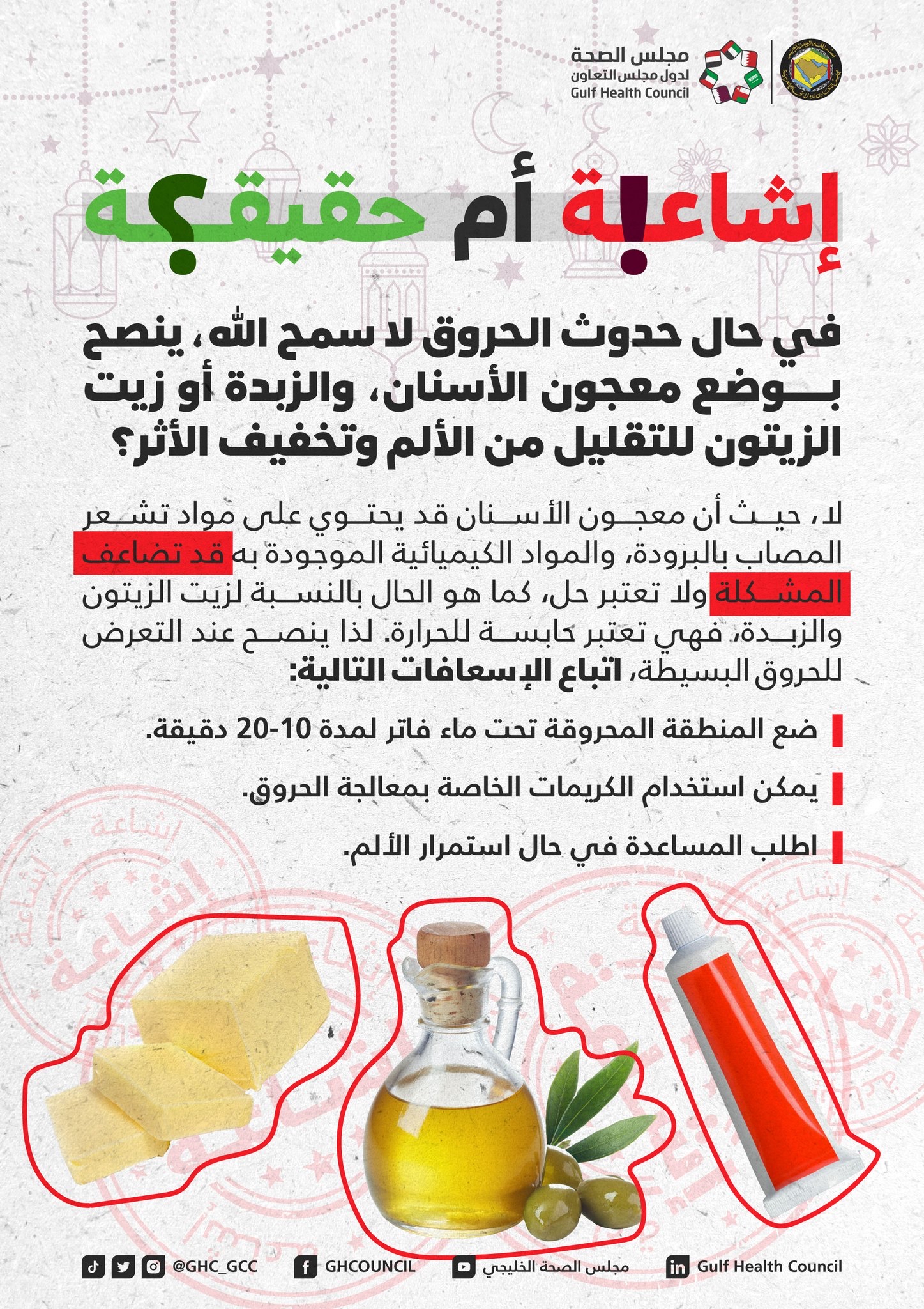 أكد مجلس الصحة لدول مجلس التعاون الخليجي أن معجون الأسنان لا يعالج الحروق، وقد يضاعف المشكلة.