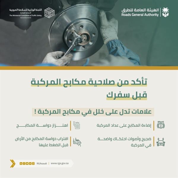 وشددت على ضرورة التأكد من صلاحية المكابح قبل السفر، لتجنب أي خطر قد يتعرض له المستخدم أو المركبة نفسها.