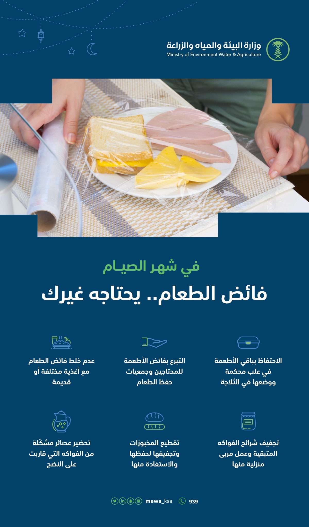 أوصت وزارة البيئة والمياه والزراعة بعدة إرشادات للحفاظ على الطعام الفائض خلال شهر رمضان، وحلول لتقليل عمليات الهدر.