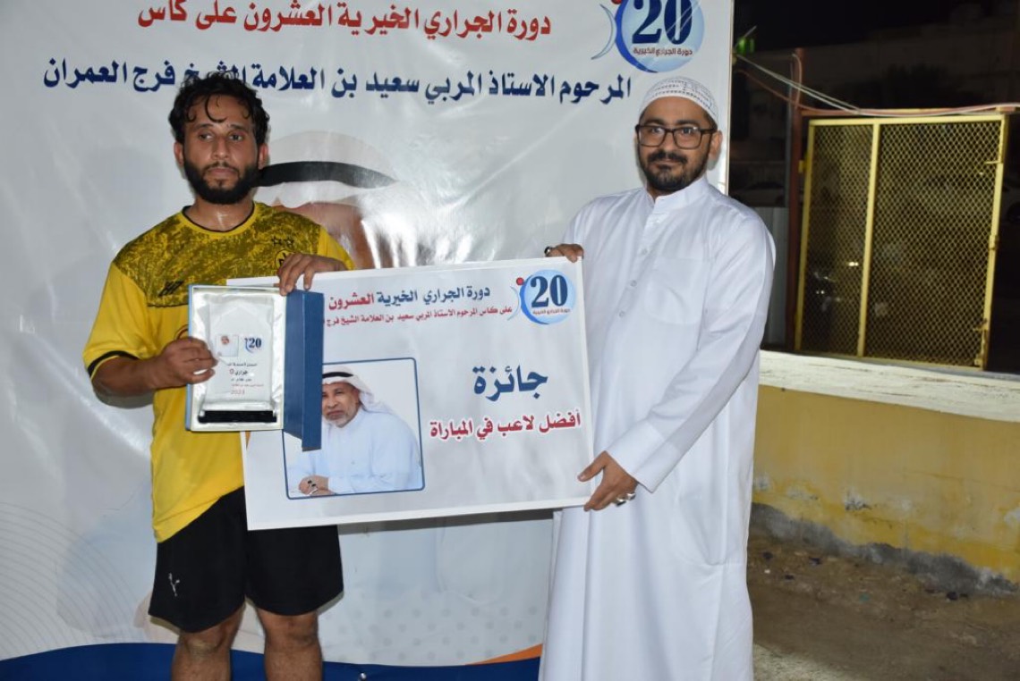 وقد اعرب من جهته رئيس اللجنة المنظمة لدورة الجراري الخيرية ”أحمد الحمران“ عن شكره وتقديره لرئيس بلدية محافظة القطيف المهندس صالح القرني لدعمه وحرصه لاستمرار البطولة وقدم شكره للشخصيات المتواجدة لأسرة عائلة العمران والى رجل الاعمال المهندس ميرزا الجشي الراعي الرسمي للبطولة وجميع الفرق المشاركة.