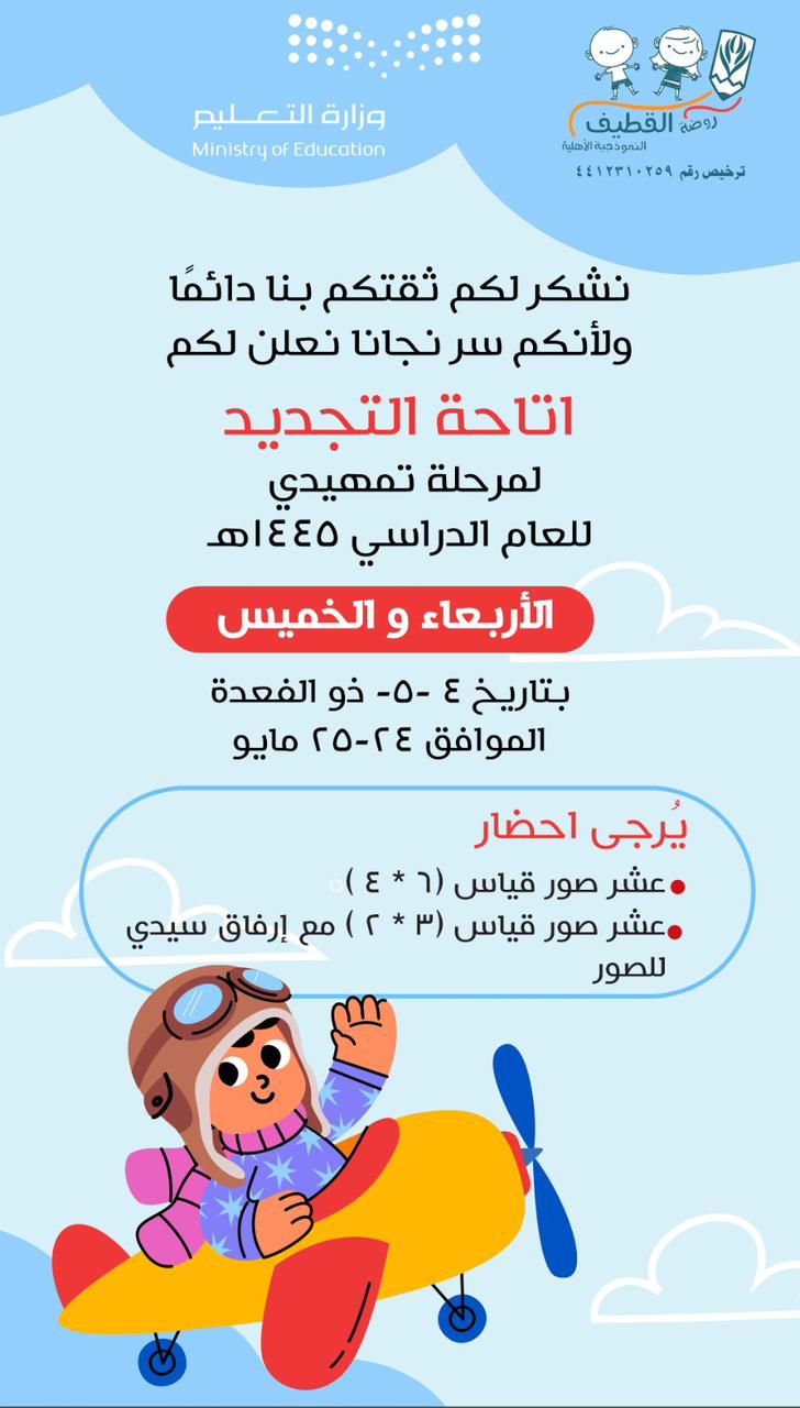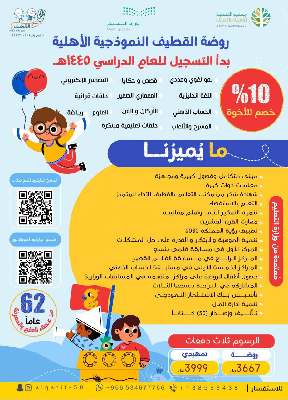 فتحت روضة القطيف النموذجية الأهلية باب التسجيل لاستقبال اطفالها الصغار للعام الجديد 1445 هـ .