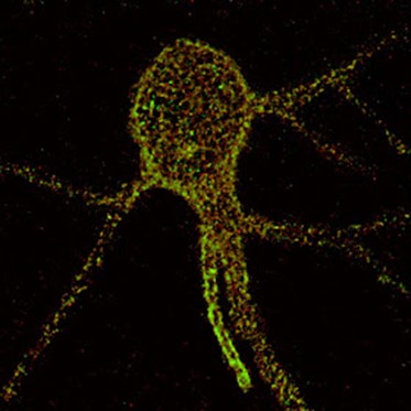 صورة لخلية بارفالبومين parvalbuminالعصبية البينية تبين شبكات الخلايا العصبية المحيطة «باللون الأحمر» تتكون من بروتين أغريكان «باللون الأخضر». يمكنك أن ترى بوضوح البنية الشبيهة بالشبكة التي تتكثف حول جسم الخلية والتغصنات العصبونية dendrites القريبة لمركز خلية بارفالبومين العصبية البينية في موقع P60 في القشرة المخية. بإحاطة المشابك العصبية الواردة على جسم الخلية والتغصنات العصبونية، تعمل شبكات الخلايا العصبية المحيطة على استقرار وتقوية الروابط المشبكية.