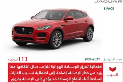 حذرت وزارة التجارة مالكي سيارات «جاكوار» من طراز ”E-PACE“، معلنة عن استدعاء 113 مركبة مصنعة بين عامي 2021 و 2024. يأتي ذلك بعد رصد خلل تقني خطير في أنظمة الأمان قد يحول الوسادة الهوائية من وسيلة حماية إلى مصدر تهديد لسلامة الركاب. وكشف التقرير الفني للوزارة أن الخلل يكمن في احتمالية تمزق الوسادة الهوائية المخصصة للراكب الأمامي عند لحظة انتفاخها، مما يفقدها وظيفتها الأساسية في الحماية ويزيد من احتمالية تعرض الراكب لإصابات... |
