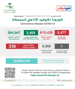 أعلنت وزارة الصحة إحصائية جديدة لمستجدات كورونا في المملكة خلال ال 24 ساعة الماضية تضمنت تسجيل ”5505“ حالة مؤكدة. ”59“ في القطيف و”10“ بصفوى ”1“ بسيهات. وبينت الإحصائية أن إجمالي عدد الإصابات في المملكة بلغ ”620935“ حالة. كما أعلنت الصحة عن تسجيل ”4349“ حالة تماثلت للشفاء، ليصل مجموع المتعافين إلى ”569296“ حالة تعافي، فيما ارتفع إجمالي الوفيات في المملكة إلى ”8908“ حالة بعد تسجيل ”2“ حالة وفاة جديدة. وبلغ إجمالي الحالات النشطة ”42,731“ حالة،... |