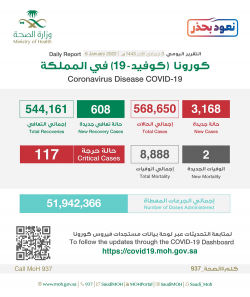 أعلنت وزارة الصحة إحصائية جديدة لمستجدات كورونا في المملكة خلال ال 24 ساعة الماضية تضمنت تسجيل ”3068“ حالة مؤكدة. ”29“ في القطيف و”16“ بصفوى. وبينت الإحصائية أن إجمالي عدد الإصابات في المملكة بلغ ”575293“ حالة. كما أعلنت الصحة عن تسجيل ”793“ حالة تماثلت للشفاء، ليصل مجموع المتعافين إلى ”545771“ حالة تعافي، فيما ارتفع إجمالي الوفيات في المملكة إلى ”8892“ حالة بعد تسجيل ”2“ حالة وفاة جديدة. وبلغ إجمالي الحالات النشطة ”20,630“ حالة، منها ”134“... |