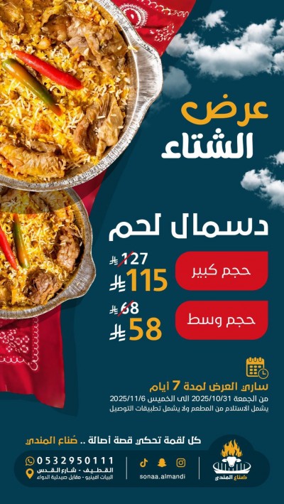 ”صناع المندى“ يقدم عروض الشتاء العرض من الجمعة إلى الخميس 6 نوفمبر كل لقمة تحكي قصة أصالة السناب: https://www.snapchat.com/add/mad9966 موقعنا: شارع القدس - مقابل صيدلية الدواء... |