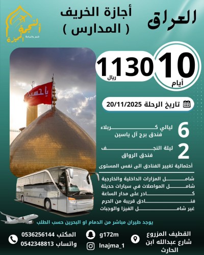 أقوى عروض السفر إلى العراق مع وكالة ”النجمة المميزة“ السناب: https://t.snapchat.com/VuoX7rPz موقعنا: المزروع - شارع عبد الله بن الحارث - مقابل الدخل المحدود... |