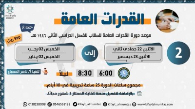 🔴 هل تبحث عن طريقة مميزة لتطوير مهاراتكـ في اختبار القدرات العامة⁉️ هل ترغب في تعزيز ثقتكـ بنفسكـ وفهمكـ العميق للمادة❓ 🎯 نقدم لك الفرصة الأمثل في دوراتنا المخصصة والمميزة 💯 التي تساعد الطلاب على التفوق والحصول على أعلى الدرجات! 📚 دورات الـقـدرات الـعـامـة بإشراف الأستاذ/ ناصر المسباع 🔹 محتوى الدورة: - كمي ولفظي. ... |