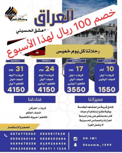 رحلات متعددة متنوعة بداية من إجازة منتصف الفصل الدراسي الأول وحتى آخر شهر رجب الأصب، طيران أو حافلة. نوفر لكم خيارات سكنية بالافطار أو بدونه في فندق من فئة الفنادق المميزة الراقية فندق فور بوينتس باي شيراتون «خمس نجوم» في حي النسيم والدي يتوفر بجواره كافة الخدمات التي يحتاجها الزائر. وتقدم القافلة لكم خدمات مميزة أبرزها: 1/ ارشاد ديني لكل رحلة. 2/ زيارة مقبرة المعلاة. 3/ حضانة مجانية وقت أداء العمرة. 4/ وجبة الذهاب. ... |