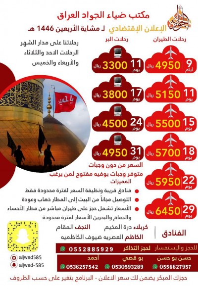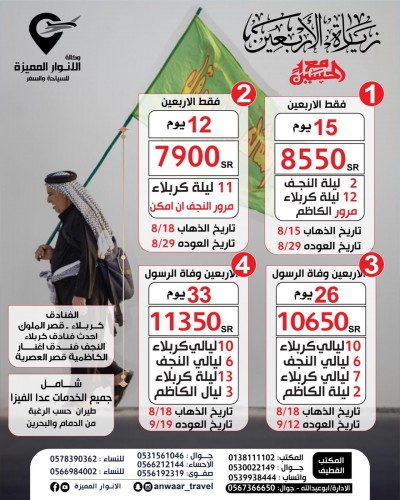 زيارة الأربعين مع ”قافلة الانوار المميزة“ 15عاما من الخبرة هاتف: 0138111102 الانستغرام: https://www.instagram.com/anwaar_travel السناب: ... |