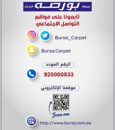 ”مفروشات بورصه“ نسيج من الخبرة والعراقة في مجال السجاد لأكثر من 64 عام متواجدين في جميع مناطق المملكة بـ 33 فرع الانستغرام: https://www.instagram.com/bursa_carpet ... |