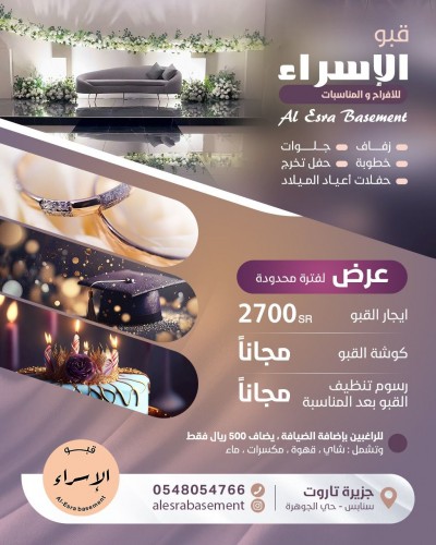 ”قبو الإسراء“ للأفراح والمناسبات الانستغرام: https://www.instagram.com/alesrabasement للاستفسارات والحجز : wa.me/966548054766 موقعنا: سنابس- حي الجوهرة... |