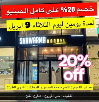 خصم 20 ٪ على كامل المنيو ليوم الثلاثاء 9 ابريل