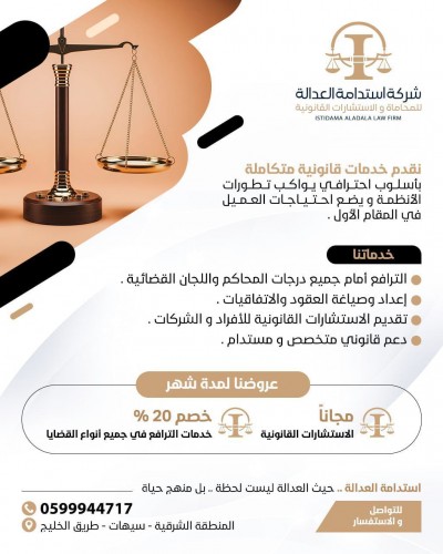 ”شركة استدامة العدالة للمحاماة والاستشارات القانونية“ تقدم خدمات قانونية متكاملة بأسلوب احترافي يواكب تطورات الأنظمة ويضع احتياجات العميل أولًا.