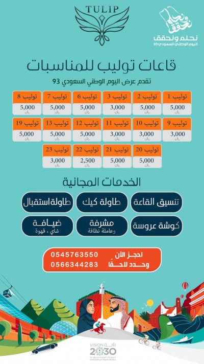 بمناسبة اليوم الوطني: القاعات الكبيرة بـ 5 الاف ريال وقاعات الجلوات والخطوبة بـ 3 الاف ريال لدى ”توليب للأفراح“ رقم الحجوزات 0566344283 0545763550 📍 موقع القاعة التي تم التصوير فيها «توليب 6» https://maps.app.goo.gl/yBeEXpXHbP3vBopu5 انستقرام قاعات توليب: ... |