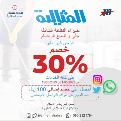 خصم 30% لدى ”شركة المثالية الدولية للنظافة“