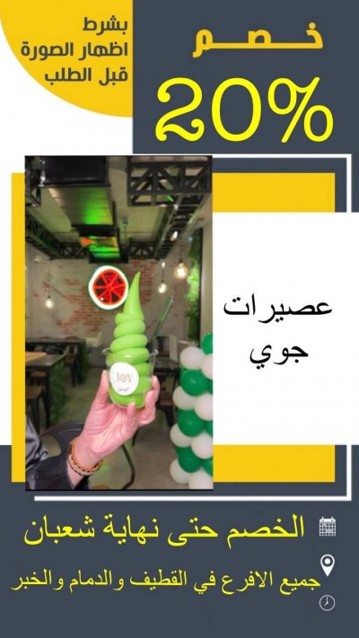 جوي JOY للعصيرات اشتر لتر ونص عصير وأحصل على الثاني مجاناً خصم 20% على كامل الفاتورة أنواع مختلفة من الحلا ⚠ العرض يشمل جميع فروع «جوي» 📍 موقعنا: ... |