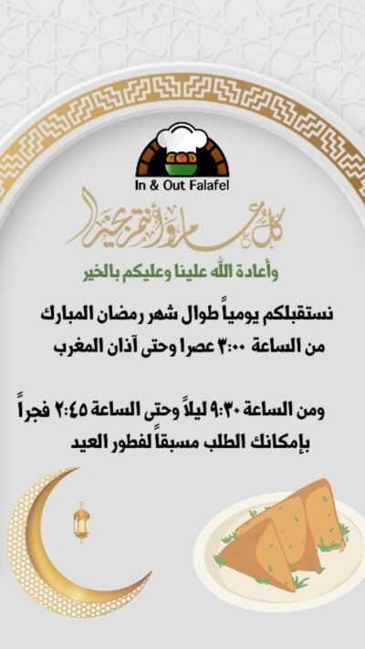 مطاعم ان اند اوت فلافل تتشرف بخدمتكم في الشهر الفضيل أوقات دوام الفروع من الساعة 3 عصرا إلى اذان المغرب ومن الساعة 9:30 مساءا إلى 2:45 فجرا نتشرف بخدمتكم في مطعمكم ان اند اوت فلافل للتواصل معنا: ... |