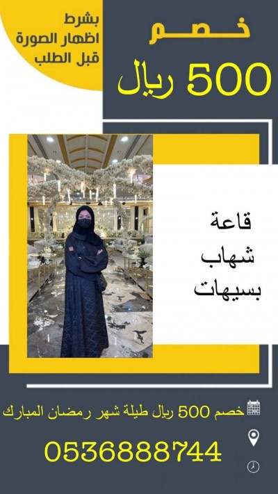 قاعة أفراح ب 1800 ريال فقط خصم 500 ريال إضافية لحامل هذا الإعلان عرض 1800 ريال عرض 2500 ريال عرض 2800 ريال أرقام التواصل: ... |