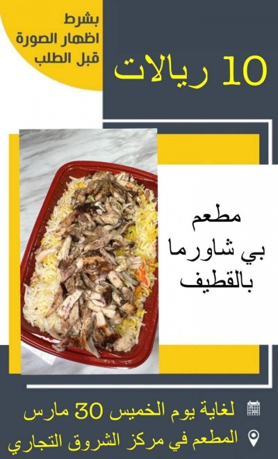 مطعم بي شاورما بالقطيف جديد رمضان رز مندي مع شاورما فتة الشاورما ”مني شاورما“ بشطة ابوديچ 📍 موقعنا: https://maps.app.goo.gl/yHTfZF2wHaxfgpQ29 الانستقرام: ... |