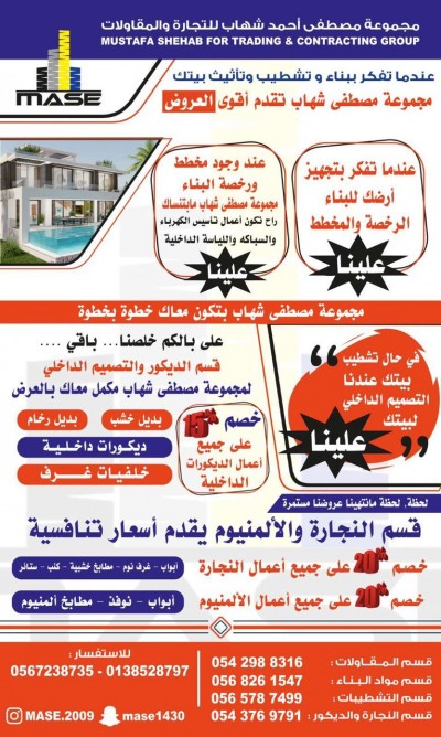 ”مجموعة مصطفى أحمد شهاب“ للتجارة والمقاولات كل ما تحتاجه في مكان واحد للتشطيبات الداخلية 0543769791 للمقاولات 0542988316 للتشطيب 0565787499 لمواد البناء0568261547 الانستغرام: ... |