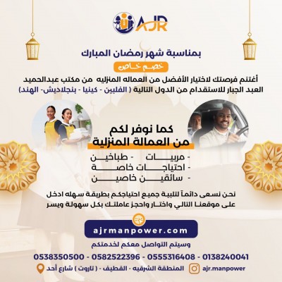 عرض خاص بمناسبة شهر رمضان المبارك اغتنم الفرصة واختر الأفضل من العمالة المنزلية من مكتب عبد الحميد العبد الجبار للاستقدام من: الفلبين كينيا بنجلاديش الهند ويوفر مكتب عبد الحميد العبد الجبار من العمالة المنزلية: مربيات طباخين سائقين خاصين ومساعدين لرعاية ذوي الاحتياجات الخاصة.. نسعى دائما لتلبية جميع احتياجاتكم بطريقة سهلة.. احجز عاملتك عبر الموقع الإلكتروني بكل سهولة WWW. AJRMANPOWER.COM ... |
