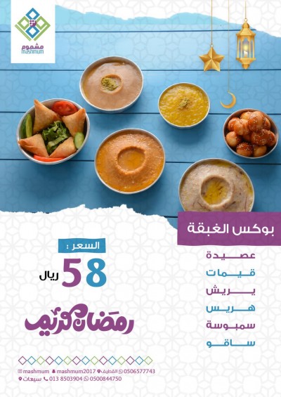 لمدة يومين خصم 50% من ”مطعم مشموم“ بسيهات والقطيف فطور رمضاني مكان للصلاة في فرع سيهات سحور متنوع توصيل مجاني عن طريق الطلب عبر الموقع الالكتروني . |