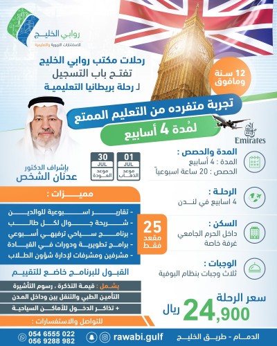 رحلات مكتب روابي الخليج تفتح باب التسجيل لـ ”رحلة بريطانيا التعليمية“