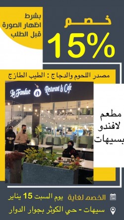 في مطعم ”لافندو“ بسيهات ينتهي الخصم بنهاية يوم السبت 15 يناير مصدر اللحوم والدواجن: الطيب الطازج الانستقرام: https://instagram.com/lafondue_restaurant?utm_medium=copy_link ... |