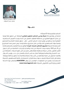 السلام عليكم ورحمة الله وبركاته إشارة إلى رؤية ورسالة ”شركة رواسي الشاطئ للتطوير العقاري“ المتمثلة في تحقيق نقلة نوعية في مجال السوق العقاري في محافظة القطيف بالعمل على انشاء وإيجاد الفرص الاستثمارية العقارية مما يساهم في توفير خيارات السكن «أراضي - فلل - شقق تمليك» المناسبة للمجتمع وتنمية عوائد المساهمين للشركة من خلال مشاريع سكنية واعدة. ومن ضمن هذه المشاريع المستهدفة للشركة مشروع الشاطئ «مسك تاروت» الواقع بمدينة القطيف والمنتظر إقامته في 19... |