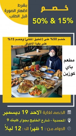 ”مطعم باي كوزين“خصم 50% على المطبق السمك والروبيان الملكي . وخصم 15% على بقية الأطباق حتى الأحد 19 ديسمبر الانستقرام: https://instagram.com/picuisine_restaurant الموقع: |