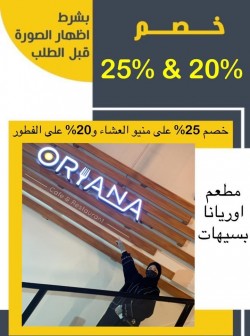 ”مطعم اوريانا“ بسيهات يقدم: خصم 25% على منيو العشاء «يستمر 10 أيام» وخصم 20% على منيو الإفطار «يستمر 3 أيام» الإنستقرام: |
