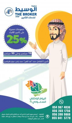 تطلق مؤسسة خطوة الوسيط " The Broker Step“ خصومات مميزة بمناسبة اليوم الوطني على تأمين الأفراد تصل إلى 25%.