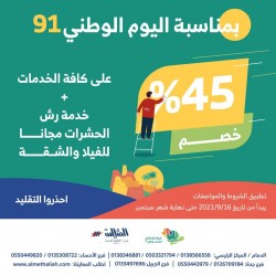 خصم 45% بمناسبة اليوم الوطني 91 على كافة الخدمات + « خدمة رش الحشرات مجانا للفيلا أو الشقة »