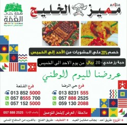 خصم 20 ٪  من الاحد إلى الخميس 23 سبتمبر على المشويات