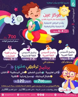 مركز عين لضيافة الأطفال التابع لجمعية مضر الخيرية بالقديح يعلن عن برامجه الصيفية التعليمية والترفيهية، مع اتخاذ كافة الإحترازات الوقائية ضد فيروس كورونا. 1 - برنامج تأسيس اللغة العربية «مستوى أول» من عمر «4 - 5» سنوات 2 - برنامج تأسيس اللغة العربية «مستوى ثاني» من عمر «6 - 7» سنوات 3 - برنامج تأسيس اللغة الإنجليزية من عمر «5 - 7» سنوات ... |