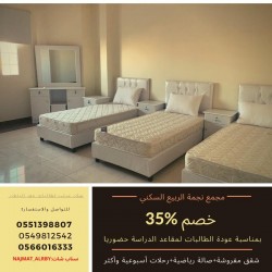 نجمة الربيع.. خصم 35% على سكن الطالبات بحفر الباطن بمناسبة عودة الطالبات للدراسة حضورياً _ تتكون الغرف من سرير ومرتبات مع المخدات خاصه ودواليب وتسريحات وكمدينات. _ كل غرفة يتوفر فيها تلفزيون خاص وثلاجه خاصة. _ كل شقة تتكون من دورتين مياه وصاله ومطبخ. كمايوجد ميكرويف مع فرن مع ثلاجة كبيرة وغساله خاصة بالشقه. _ يتكون السكن من صالة رياضية مجانية للطالبات مع وجود خيمة خاصة بالطالبات. _ وجود مقهى للطالبات بداخل السكن للترفيه مع بعض... |