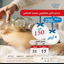 خصومات مميزة في ”قبسات الخير للحجامة“ حاصل على ترخيص من وزارة الصحة والمركز الوطني للطب البديل وتحت إشراف مجموعة طبية ذات خبرة تتجاوز العشر سنوات. خصم من 200 ريال إلى 150 ريال .. يسري العرض من 17 شوال إلى 22 شوال أرقام التواصل: 0138631401 0551717146 |