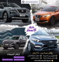 عرض حرق الاسعار 🔥🔥 على سيارات «نيسان - شيري - جاك» على المبيعات النقديه تقدم الشركه الوطنيه للسيارات عروضها على السيارات 🚘🚘 على الكاش ونظام التأجير المنتهي بالتمليك وعروضنا كالتالي 1️⃣العرض الاول 💸رواتب من 3500 في التعريف والحساب 🚫بدون دفعه 🚫بدون رسوم عمر من 18 سنه ... |