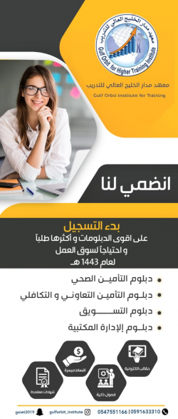 بدء التسجيل في الدبلومات المعتمدة والأكثر طلبا لاحتياج سوق العمل لاتتراجعي عن تحقيق حلمك وطموحك.. التحقي بهذه الدبلومات من معهد مدار الخليج العالي للتدريب النسائي.. 🔹دبلوم التأمين الصحي 🔸دبلوم التأمين التعاوني والتكافلي 🔹دبلوم التسويق 🔸دبلوم الإدارة المكتبية ... |