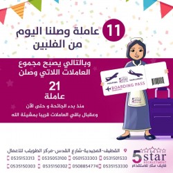 11 عاملة وصلن اليوم من الفلبين 🇵🇭 وبالتالي يصبح مجموع العاملات اللاتي وصلنا هو 21 عاملة منذ بدء الجائحة وحتى الأن وعقبال باقي العاملات قريبآ بمشيئة الله تعرف أكثر على فايف ستار للاستقدام http://youtu.be/A-Qq4eTQs6k لماذا عملائنا أختاروا فايف ستار للاستقدام؟ http://youtu.be/RPz7sQ01utc لخدمتكم بشكل أفضل..التواصل معنا صار أسهل 10 من مسؤولي خدمة العملاء حاضرون للرد على مكالماتكم ورسائلكم ... |