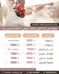 يشبهك قلبي كأنك لقلبي مخلوق 3> .. استمتع بليلة زواجك مع باقات قصور شهاب قصور شهاب للمناسبات والأفراح تقدم باقة من العروض لإحياء ليالي العاشقين.. ،, اختر الباقة التي تناسبك.. حجز الصالات متاح لـ: - حفلات الخطوبة أو الجلوات ... |