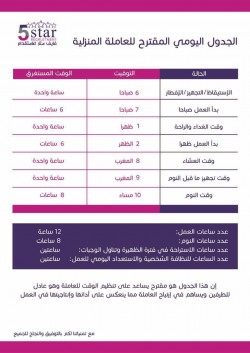 فايف ستار يهديكم جدول العاملة المنزلية المقترح والذي ينظم أوقات العاملة مما ينعكس أيجابيآ على أدائها وإنتاجيتها بالعمل خليها علينا فنحن على أتم الإستعداد لمساعدتكم في جميع شؤون عاملتكم ⭐️⭐️⭐️⭐️⭐️ لخدمتكم بشكل أفضل..التواصل معنا صار أسهل تعرف أكثر على فايف ستار للاستقدام https://youtu.be/A-Qq4eTQs6k لماذا عملائنا أختاروا فايف ستار للاستقدام؟ ... |