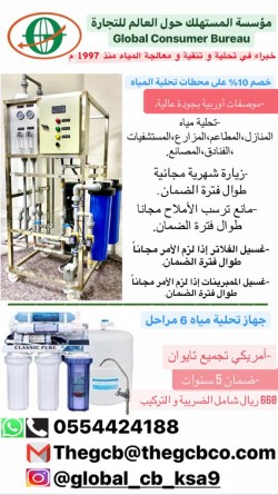 مؤسسة المستهلك حول العالم" للتجارة خبراء في معالجة وتحلية المياه منذ 1997 عروض على أجهزة ومحطات تحلية المياه Classic pure 660 ريال شامل الضريبة والتركيب جهاز تحلية مياه 6 مراحل أمريكي تجميع تايوان التصفية والتنقية وإزالة الشوائب ومعالجة الأملاح. وأيضاً... خصم 10% على محطات تحلية المياه للمنازل والمزارع والفنادق والمصانع بسعة إنتاجية من 10000 لتر إلى 80000 لتر في اليوم... ... |