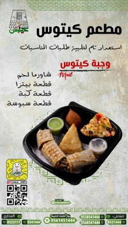 عندك مناسبة... مطعم كيتوس ”يزبطك“ 🔻استعداد تام لتلبية طلبات الزبائن🔻 احظى بتجربة طعم لاينسى ✔ ▪بوفيهات ضيافة مع خدمة ▫طاقم مدرب لتقديم الخدمات ▫تشكيلة واسعه من الأطباق تحضر بعناية ▪وجبات حسب الطلب ... |