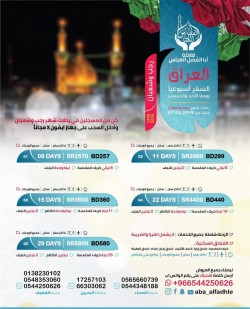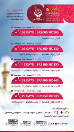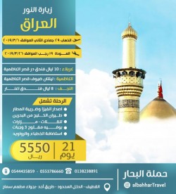 تعلن حملة نور الهداية عن عرضها المذهل للزيارة الشعبانية إلى العراق عبر طيران الخليج. شامل جميع الخدمات عدا الفيزا.. كما يوجد لدينا خدمة التفييز فنادقنا 5 نجوم.. للحجز والاستفسار: 0505819316 - 0539233315 ... |