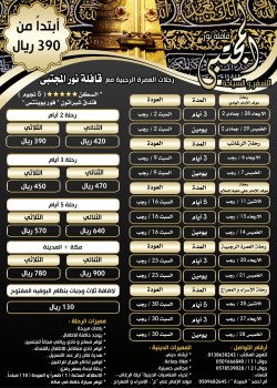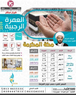 تعلن قافله نور المجتبى عن آخر المقاعد لرحلة الإسراء والمعراج يومي الاثنين والاربعاء للعمرة الرجبية.. السكن في فنادق خمس نجوم.. للتواصل: المكتب - 0138630243 جوال - 0501666840 - 0578539028 للنساء - 0509682645 موقعنا: https://maps.google.com/?q=26.573435,50.008007 ... |