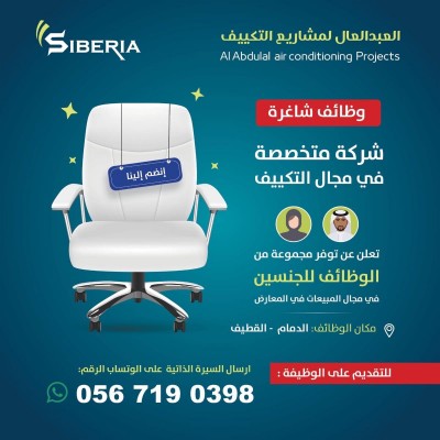 تعلن شركة العبد العال لمشاريع التكييف، المتخصصة في مجال التكييف، عن توفر عدد من الوظائف الشاغرة للجنسين، وذلك للعمل في مجال المبيعات داخل المعارض. مكان العمل: الدمام - القطيف وتدعو الشركة الراغبين والراغبات في التقديم ممن تتوفر لديهم الرغبة والقدرة على العمل في مجال المبيعات، إلى إرسال السيرة الذاتية عبر تطبيق واتساب على الرقم التالي: 0567190398... |