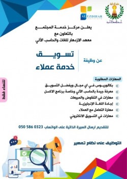 يعلن مركز خدمة المجتمع بالتعاون مع معهد الازدهار للغات والحاسب الآلي عن توفر وظيفة بمسى «تسويق وخدمة عملاء». المهارات المطلوبة: شهادة بكالوريوس في أي مجال ويُفضل التسويق. معرفة جيدة بالحاسب الآلي وخاصة برنامج «إكسل». مهارات في التفاوض والمبيعات. إجادة اللغة الإنجليزية. مهارة التعامل مع العملاء. ... |