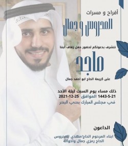 تحتفل عائلة المحروس وجمال في القطيف مساء يوم السبت بزفاف الشاب ماجد مهدي المحروس على كريمة الحاج رمزي جمال «أبو أحمد» في مجلس المبارك بحي البحر وسط فرحة الأهل والأصدقاء ومحبي العريسين. وعبر العريس عن سعادته الغامرة بدخوله القفص الذهبي، سائلا الله أن يوفقه وعروسه ويرزقهما الذرية الصالحة. أسرة ”جهينة الإخبارية“ تهنئ العريسين وعائلتيهما وتسأل الله ان يبارك لهما، متمنين لهما حياة سعيدة ‏ ...